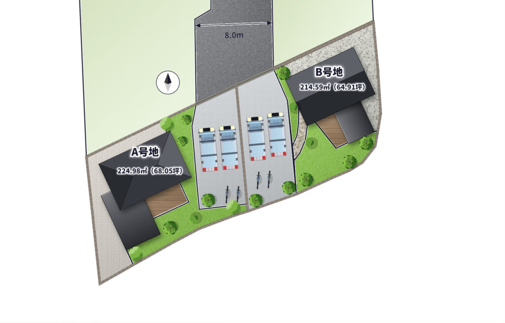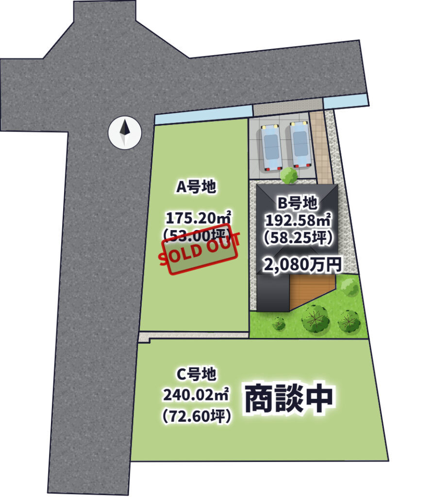 - 造成中ではありますが、すでに1区画ご契約済み。もう一区画も商談中の造成完成までに埋まってしまいそうな勢いの分譲地です。